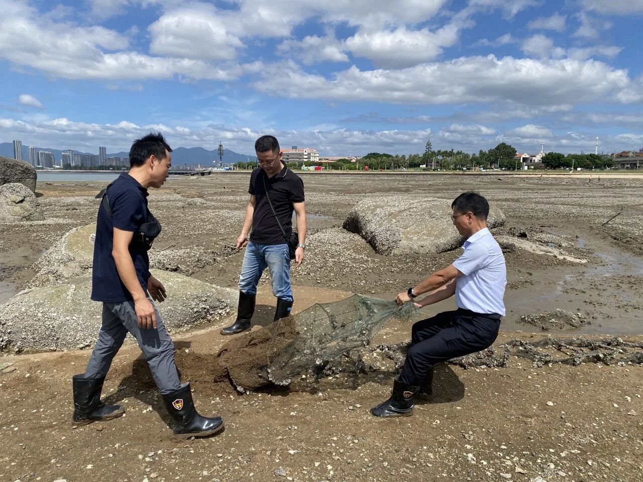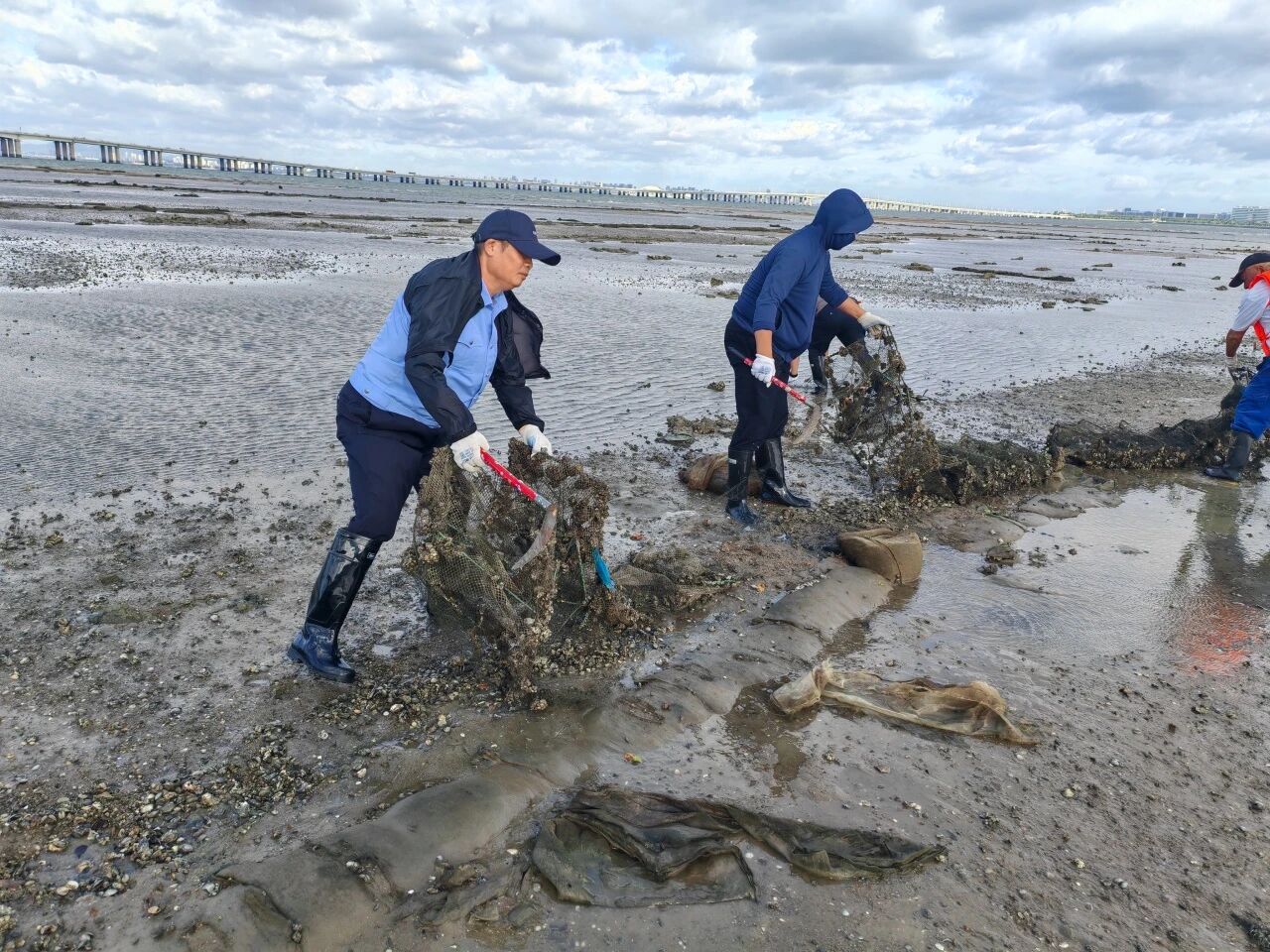 针对滨海旅游景点、网红打卡地、重要道路(桥梁)及周边海域滩涂,支队深入开展全面排查,及时掌握违规网具分布情况,灵活组织拆除清理,特别是针对集美杏林湾大酒店、园博苑水闸口、十里长堤等外侧海域残留海蛎石、竹竿及废旧地笼,发现问题、迅速行动,集中力量连续开展专项清理,做到“无死角、无残留”,确保沿岸、沿桥、沿路景观水域整洁清爽。
