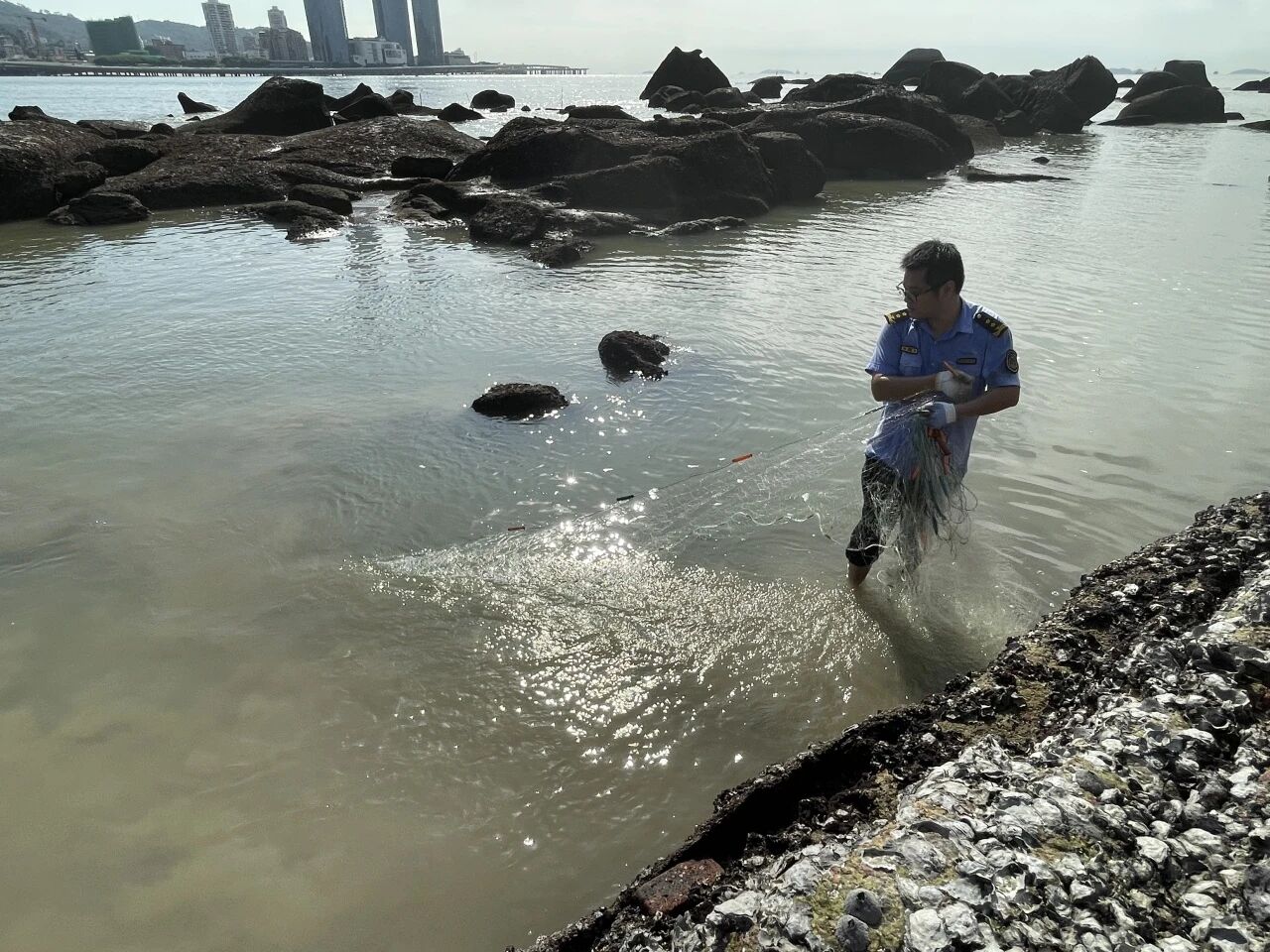 执法人员徒手清理废旧地笼