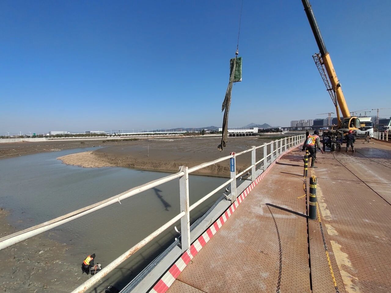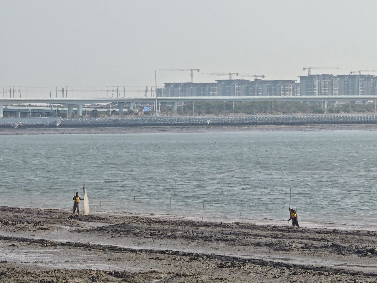 滩涂深处,拆除人员半身深陷冰冷淤泥,仍奋力拉扯深埋其中的网具绳索;桥面之上,吊车舒展钢铁长臂,将附着桥墩、沉于水下的大型围网整体吊离,湿漉漉的绿色网具在阳光下格外扎眼,执法人员与工人们协力将其卷捆装车,转运离场。暖阳之下,汗水、海水夹杂着淤泥在工作人员的脸上闪闪发光。