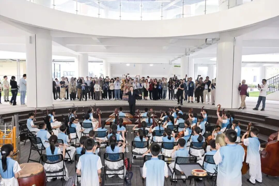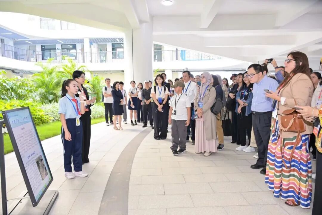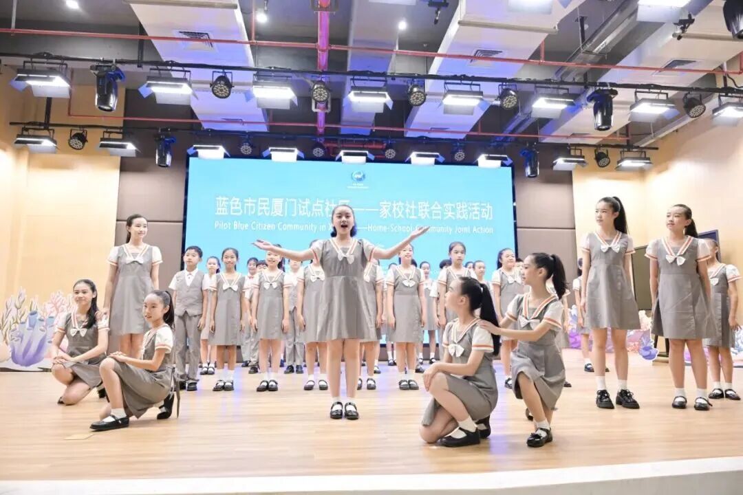 作为海沧科学教育实验区“蓝色市民”特色教育的实践探索地,厦门双十中学海沧附属学校为参访团展示了蓝色市民课程与实践成果。小小讲解员声情并茂的讲解,形式多样的海洋主题创意美术手工作品展览,展现了海沧在海洋科学教育领域的深耕与创新。学生家长、闽茶企业为参访团带来了闽南蚵仔煎、茶文化体验等展示,让大家既品尝美食又认识到吃喝住行与海洋的关联。随后在厦门双十中学海沧附属学校与厦门市湖明小学的学生们带来的《海底一万米》科普剧与《大海啊故乡》大合唱中拉开了序幕。