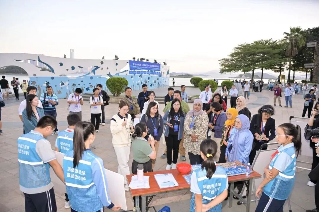 下午的平行活动将理念转化为行动,在厦门双十中学海沧附校、厦门海沧区海湾社区蓝色市民服务站、厦门小小鸥自然生态科普推广中心的支持下,蓝色市民社区游园与学生实践在海沧湾公园百姓舞台同步开展,20余位“蓝色市民小小引导员”带领社区居民与参访团共同互动,沉浸体验海洋素养知识框架,并在此基础上开展红树林生态认知和海洋垃圾艺术创作。在厦门双十中学海沧附校东屿校区三乐厅,由野生救援(WildAid)执导的《探秘红树》《海底净网》等四部海洋保护微纪录片连续展映,以影像之力唤起同学们对海洋生态的关注。与此同时,一群海沧户外运动爱好者,他们也是热爱海洋的蓝色市民,在火烧屿进行清滩活动,以实际行动为清洁海洋贡献自己的力量。