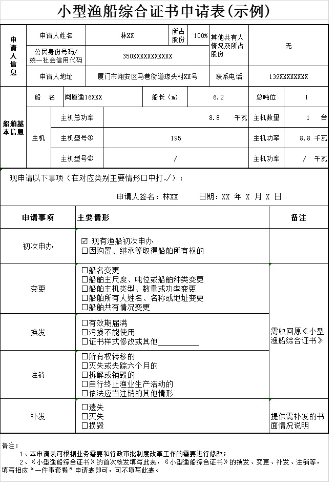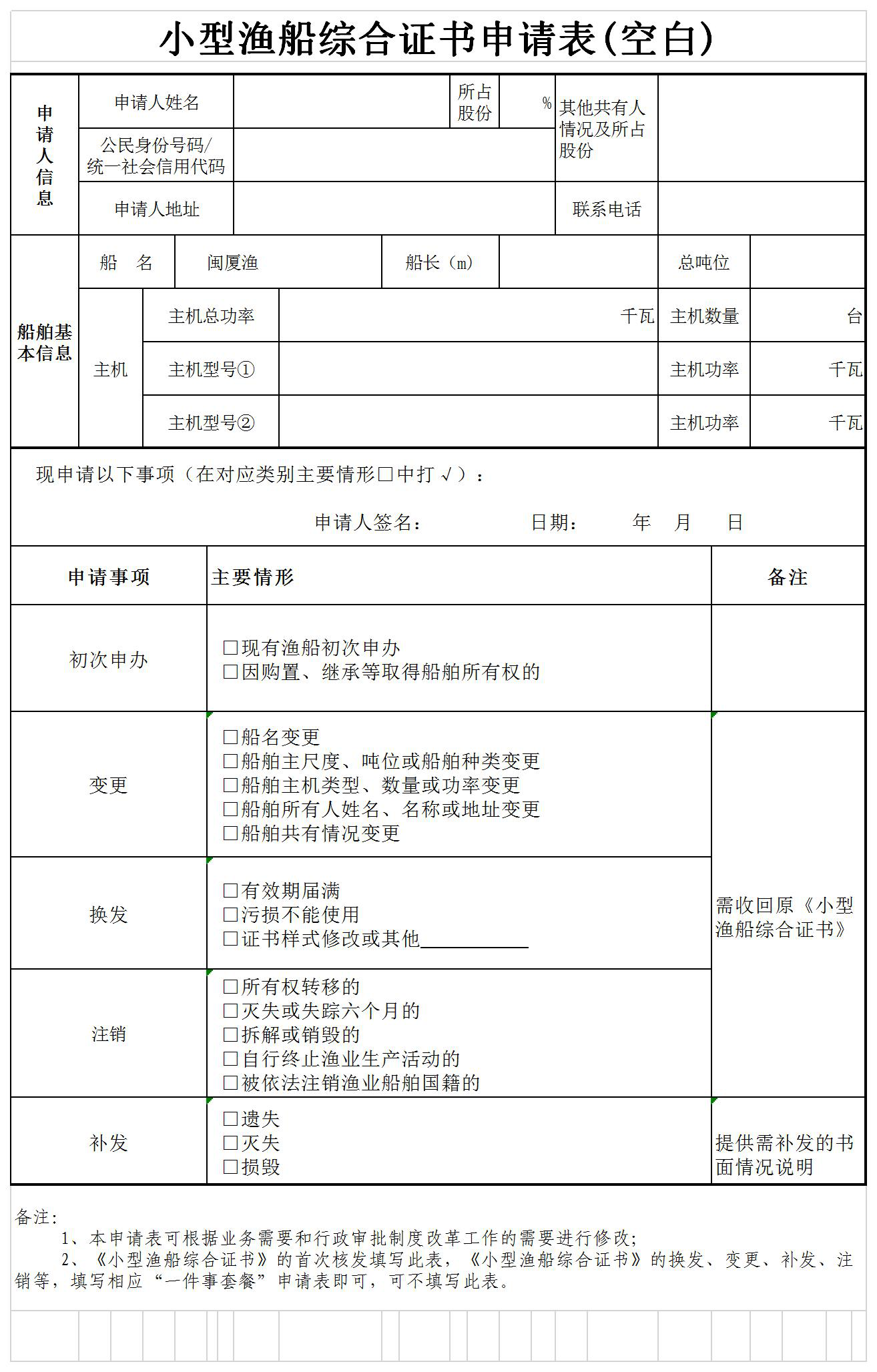 因原《小型渔船综合证书》有效期届满、污损不能使用或证书样式修改原因需要换发的。