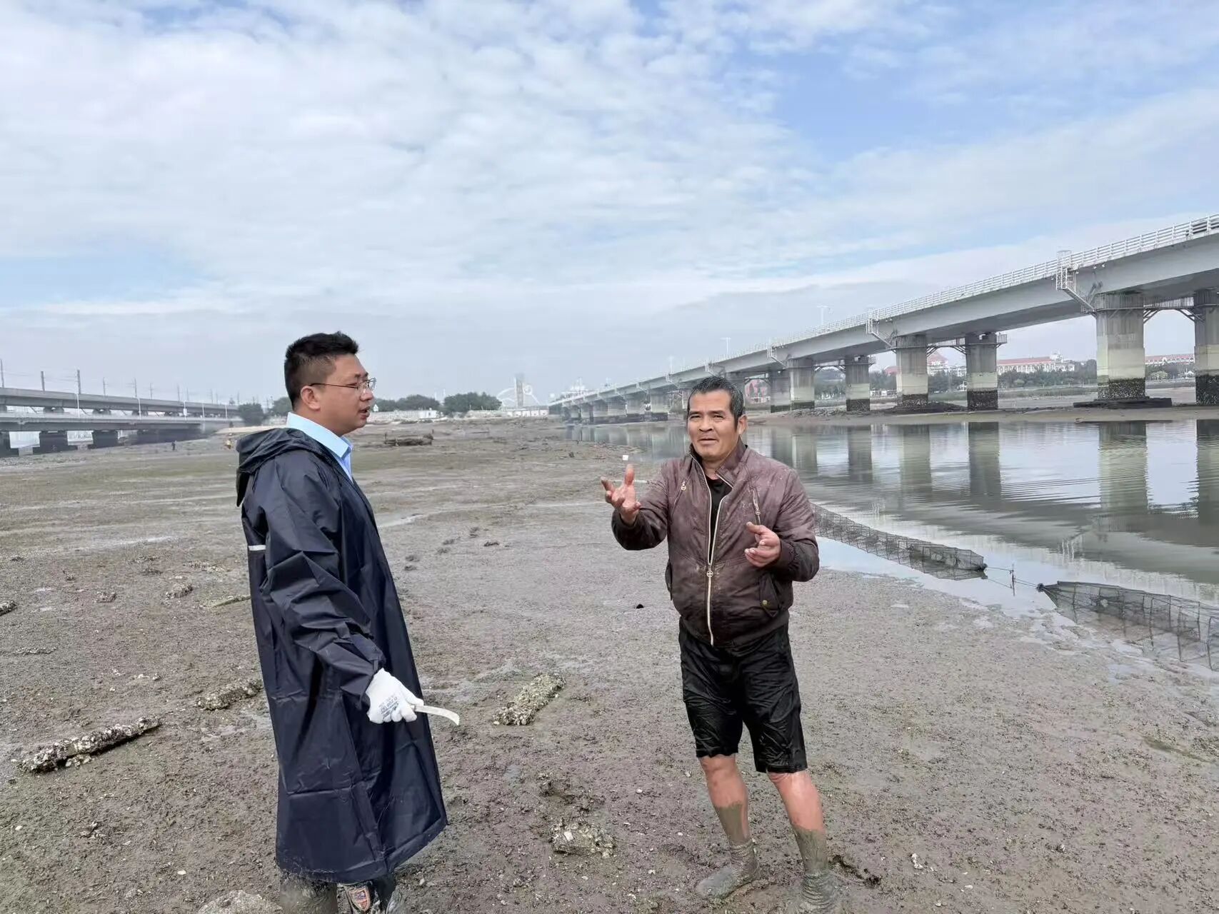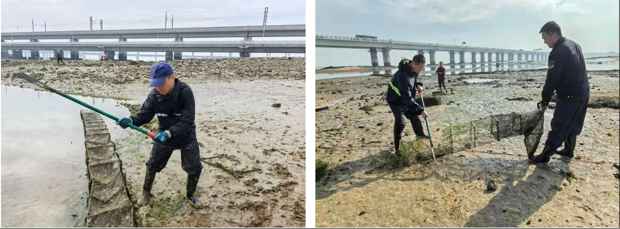 此次行动中,二大队党支部党员先锋队充分发挥先锋模范作用,深入滩涂一线,针对十里长堤、厦门大桥周边海域违规网具进行拉网式排查和清理。队员们不畏艰难,蹚泥涉水,徒手拆除并清理违规设置的“火车网”50余节。此类网具不仅破坏海洋生态平衡,同时对幼鱼资源造成毁灭性破坏。清理后,原本“满目疮痍”的滩涂终于恢复本应有的碧海银滩。