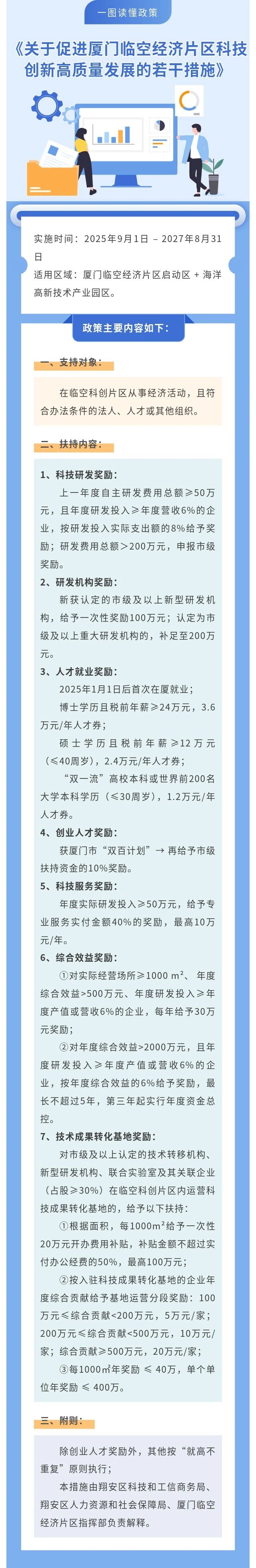 近期,厦门临空经济片区与翔安区联合出台了《关于促进厦门临空经济片区科技创新高质量发展的若干措施》(厦翔科技工信商务〔2025〕18号),该政策将有力推动临空经济片区的科技成果转化、科技创新融合产业创新,聚力打造高品质创新生态。