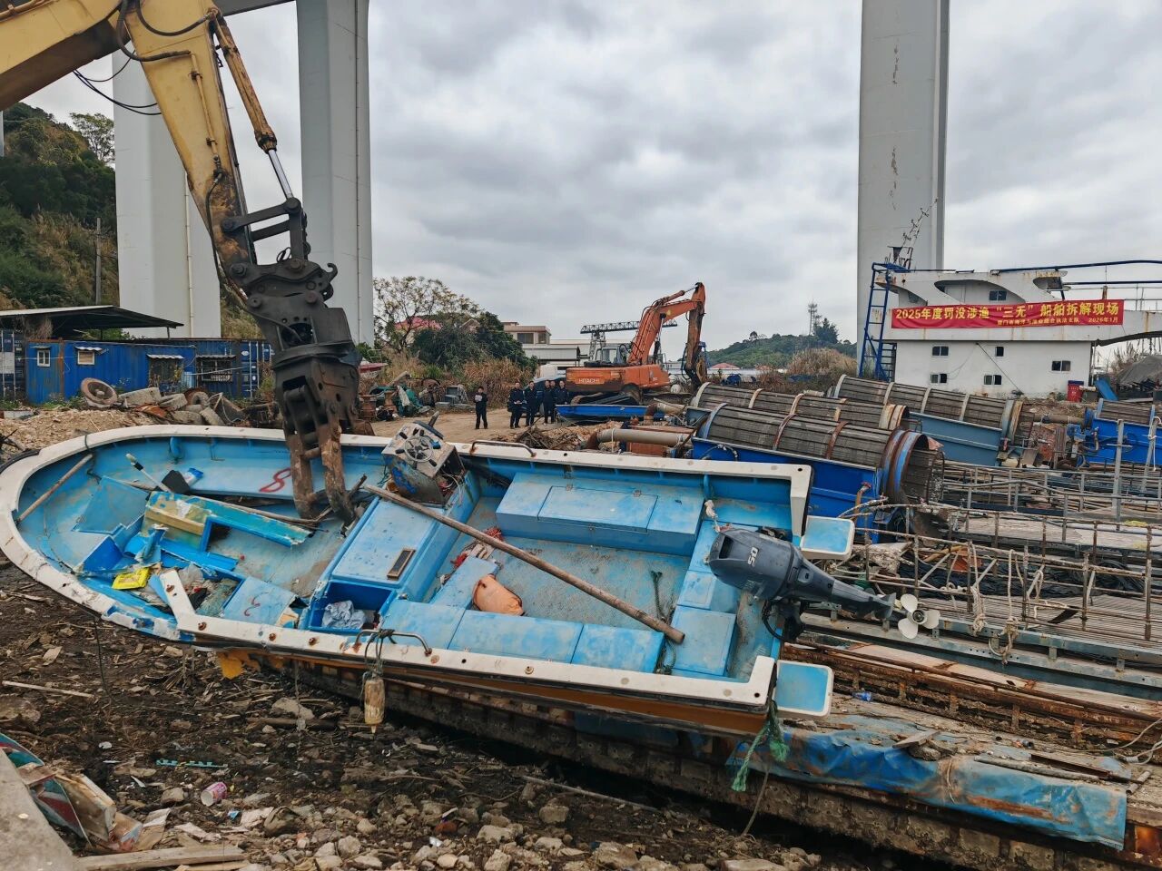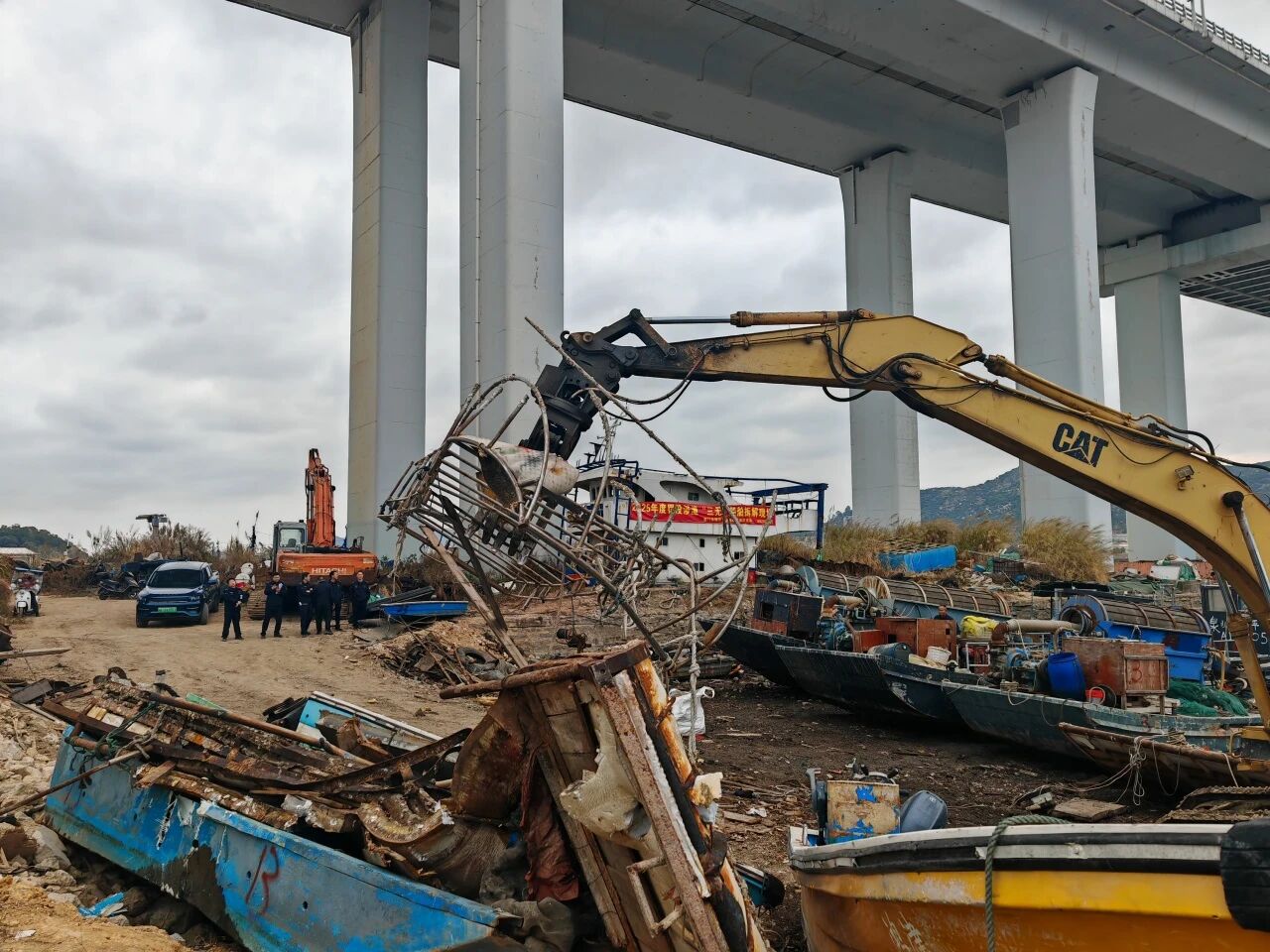 随着挖掘机“挥拳”重重砸向涉渔“三无”船舶,一艘艘木质、玻璃钢“三无”船舶,伴随着“折断声”“撕裂声”瞬间被肢解压碎,铁制“三无”船舶驾驶台、龙骨、主机等设备设施被逐一切割或破坏。为杜绝“船舶残体”再次流入市场用于非法作业,委托第三方监理单位对整个拆解过程进行现场监督,并对每艘“三无”船舶的拆解过程进行拍照记录,确保“三无”船舶全部拆解销毁。