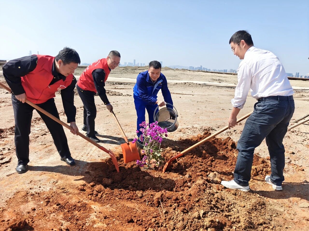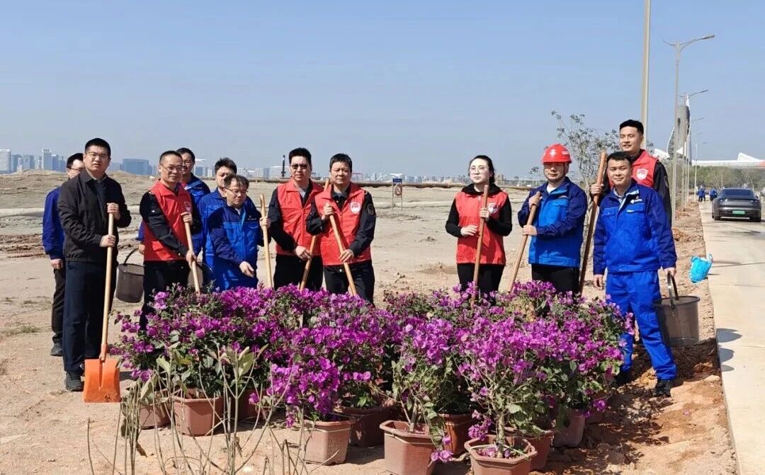 活动现场,党旗迎风飘扬,气氛热烈融洽。大家热情高涨、分工协作,挥锹铲土、扶苗填坑、提水浇灌,每一个环节都一丝不苟,配合默契。经过一番辛勤劳作,一棵棵新栽种的三角梅舒枝展叶,为初春的项目驻地增添了盎然生机。随后,大家还对周边的绿化带进行了细致的养护清理,拔除杂草、修剪枯枝、清理杂物,让原本整洁的环境更显清新亮丽、绿意萌动。一锹土,种下的是生态文明的希望;一桶水,浇灌的是携手共建的情谊。