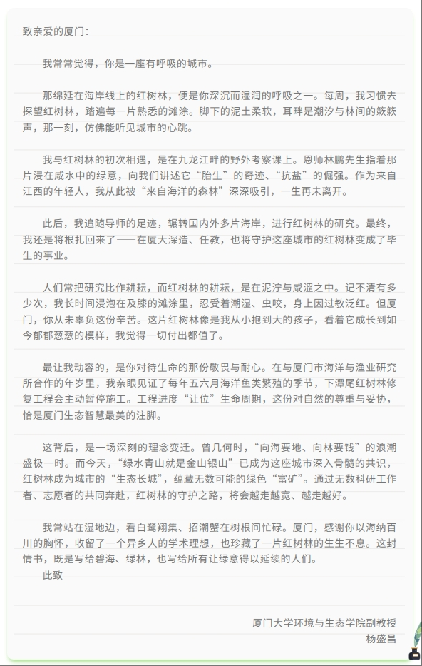 入眼是连绵的翠绿,抬头是振翅的鹭鸟……下潭尾红树林公园不仅是全省最大人工红树林,更是厦门“人海和谐、共生共荣”的鲜活见证。在这片红树林,有一个绵延数十载的深情故事。近日,厦门大学环境与生态学院副教授杨盛昌寄来一封《与厦门的情书》,字里行间既有科研工作者的热忱,也有对厦门生态智慧的由衷赞叹。